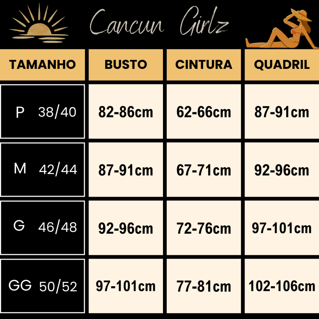 💡 Dica importante: Cada marca tem sua forma de modelagem. Para evitar trocas, recomendamos escolher seu tamanho com base nas suas medidas (busto, cintura e quadril). É rápido e evita erros.