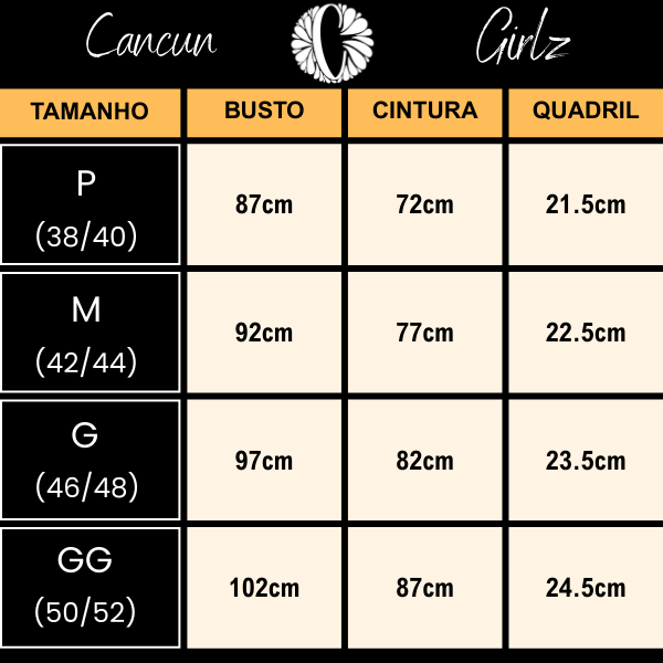 💡 Dica importante: Cada marca tem sua forma de modelagem. Para evitar trocas, recomendamos escolher seu tamanho com base nas suas medidas (busto, cintura e quadril). É rápido e evita erros!