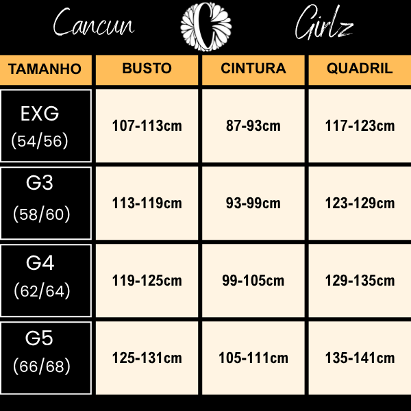 💡 Dica importante: Cada marca tem sua forma de modelagem. Para evitar trocas, recomendamos escolher seu tamanho com base nas suas medidas (busto, cintura e quadril). É rápido e evita erros!