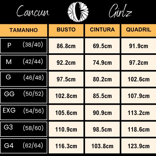 💡 Dica importante: Cada marca tem sua forma de modelagem. Para evitar trocas, recomendamos escolher seu tamanho com base nas suas medidas (busto, cintura e quadril). É rápido e evita erros!