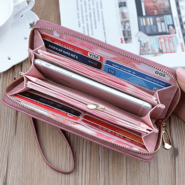 Ela é feita de couro sintético macio, possui compartimentos internos bem organizados e está disponível em diversas cores.
