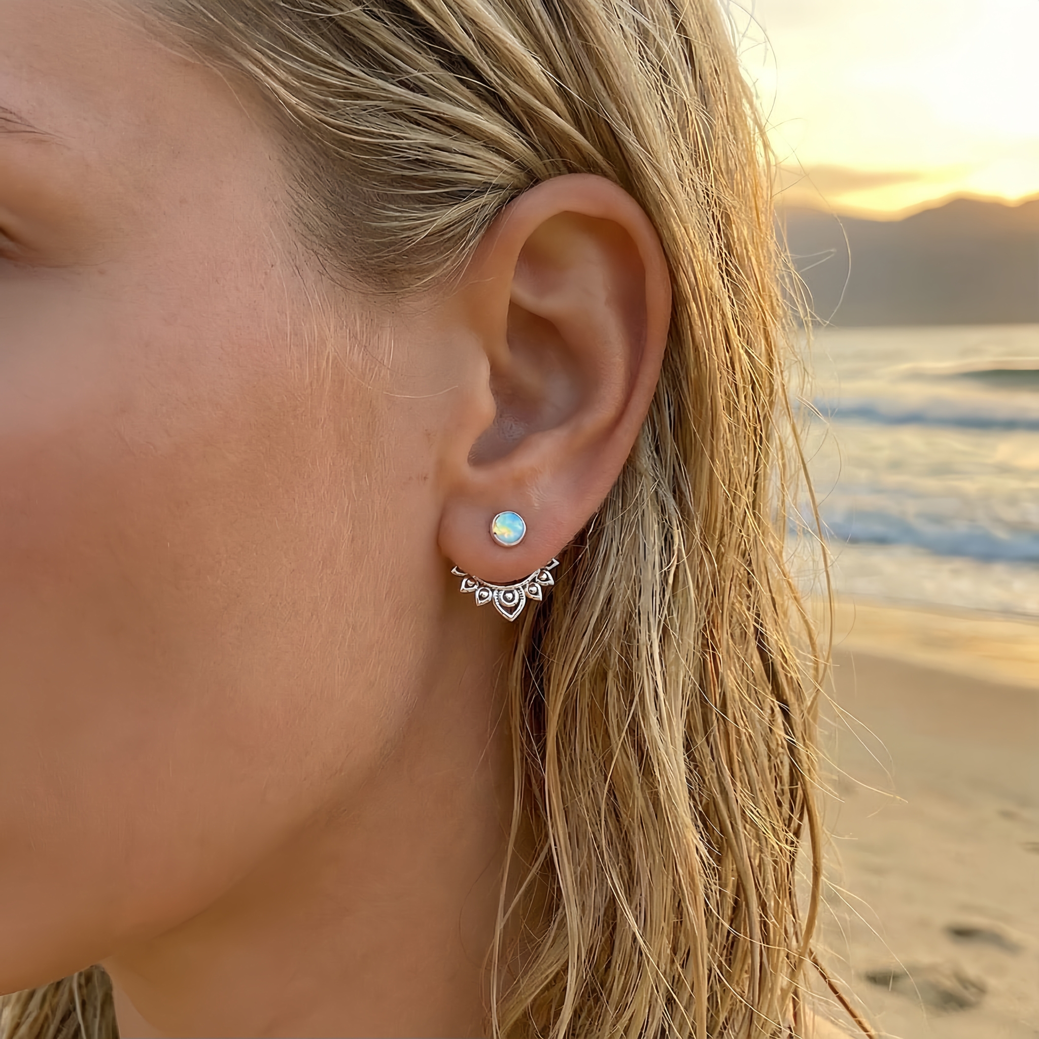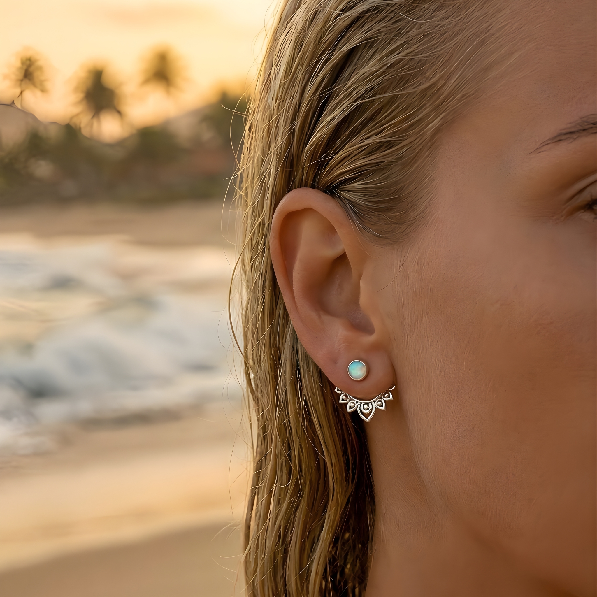 O brinco traz o toque final que faz diferença. Ele sai do comum e leva o visual de praia para outro nível, sem exageros.
