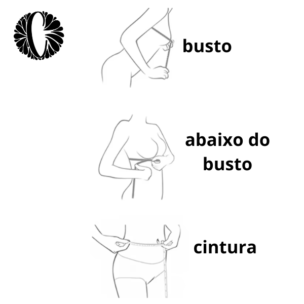 Meça a parte mais larga do seu busto com a fita métrica paralela ao chão. Esta medida irá ajudá-la em determinar o tamanho da sua lingerie, ou roupa (tops e vestidos).