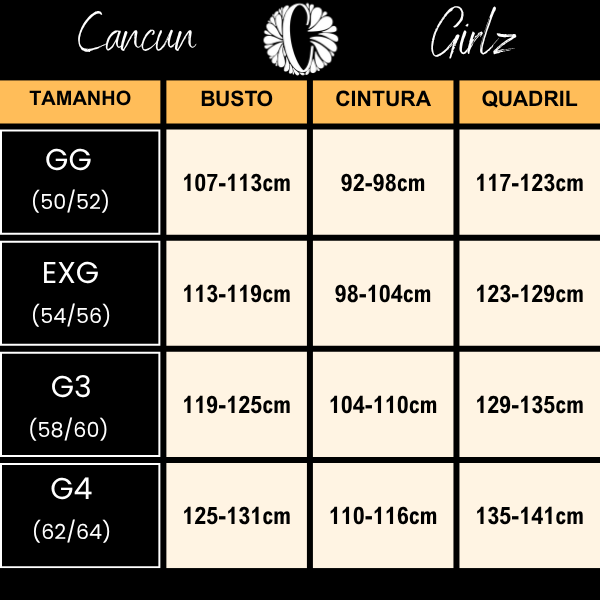 💡 Dica importante: Cada marca tem sua forma de modelagem. Para evitar trocas, recomendamos escolher seu tamanho com base nas suas medidas (busto, cintura e quadril). É rápido e evita erros!