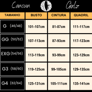 💡 Dica importante: Cada marca tem sua forma de modelagem. Para evitar trocas, recomendamos escolher seu tamanho com base nas suas medidas (busto, cintura e quadril). É rápido e evita erros!