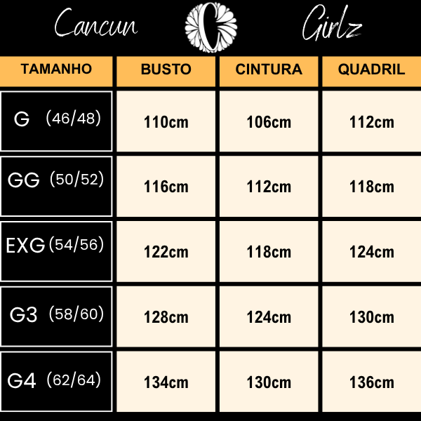 💡 Dica importante: Cada marca tem sua forma de modelagem. Para evitar trocas, recomendamos escolher seu tamanho com base nas suas medidas (busto, cintura e quadril). É rápido e evita erros!