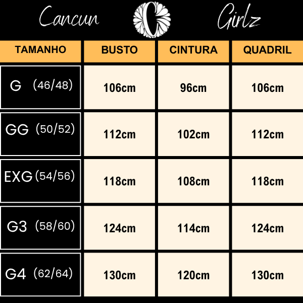 💡 Dica importante: Cada marca tem sua forma de modelagem. Para evitar trocas, recomendamos escolher seu tamanho com base nas suas medidas (busto, cintura e quadril). É rápido e evita erros!